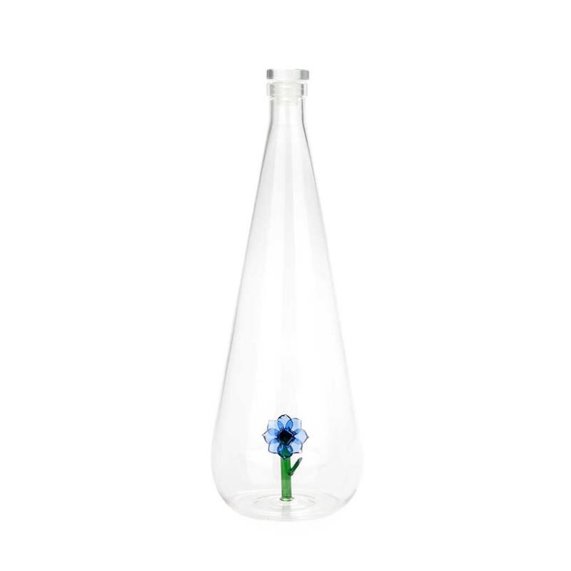 Botella de vidrio para agua. Al poner el agua hace efecto lupa y se amplía la figura interior. Incluye un tapón de cierre hermético fabricado en plástico para mayor durabilidad. Es apta para la nevera.