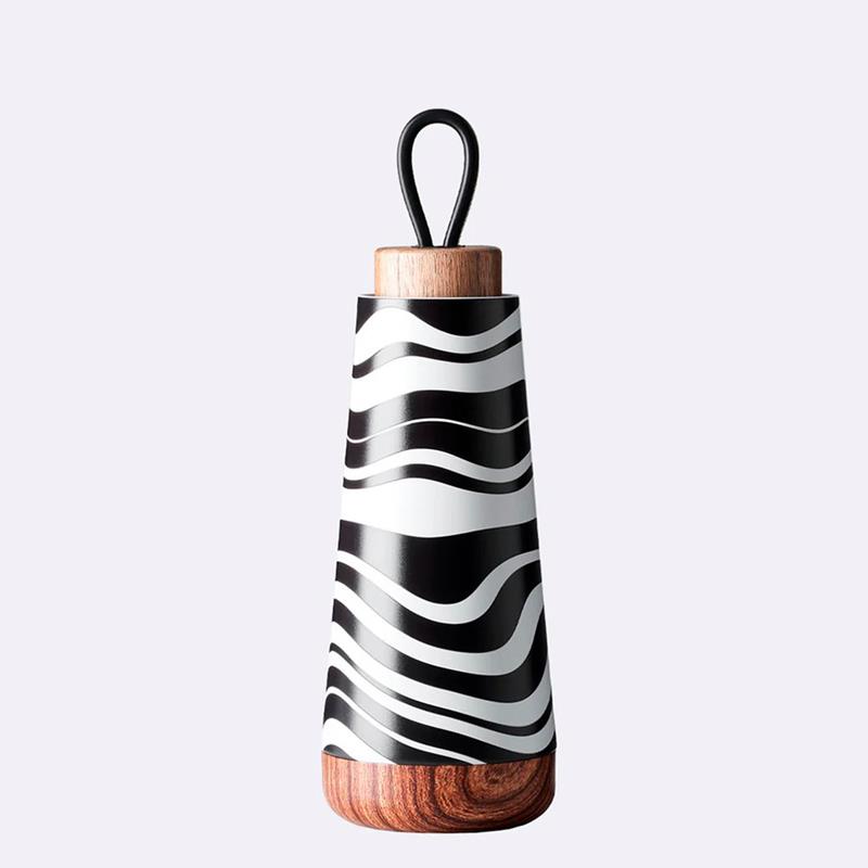 Termo que mantiene las bebidas calientes hasta 18 horas y frías hasta 12 horas. La tapa es de madera con asa de silicona. Doble pared de acero inoxidable 304.