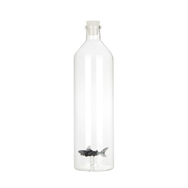 Botella de agua con un tiburón en el interior de la botella, en cristal. Al poner el agua hace efecto lupa y se amplía la figura interior.