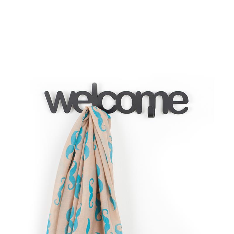 Divertido colgador con dos enganches que forma la palabra welcome. Los enganches sirven para colgar prendas de ropa y complementos. Fabricado en metal para una gran resistencia y durabilidad.