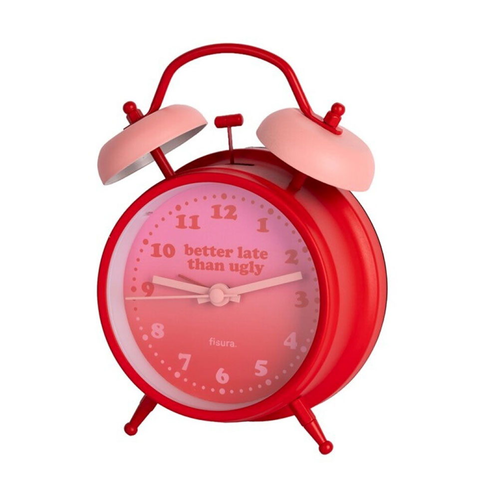 Reloj despertador de color rojo con pequeños detalles en rosa. Con saetas totalmente silenciosas, gracias a su movimiento continuo.