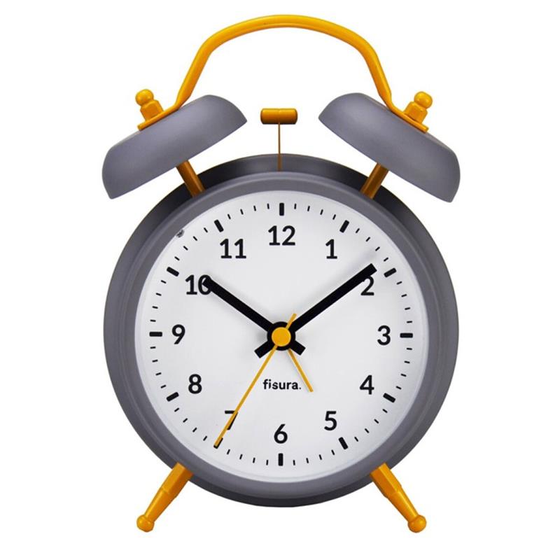 Reloj despertador de color gris con pequeños detalles en amarillo. Con saetas totalmente silenciosas, gracias a su movimiento continuo.