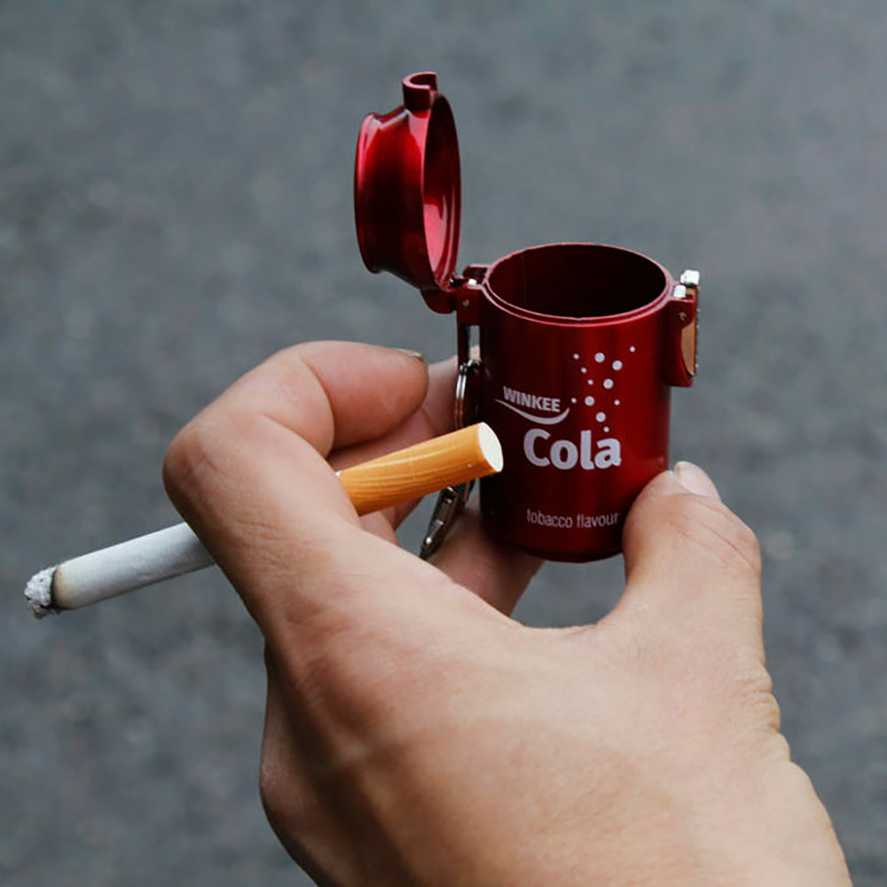 Cenicero divertido con forma de lata de bebida. Incluye un pequeño mosquetón, para llevarlo más fácilmente y su apertura es mediante un botón lateral.