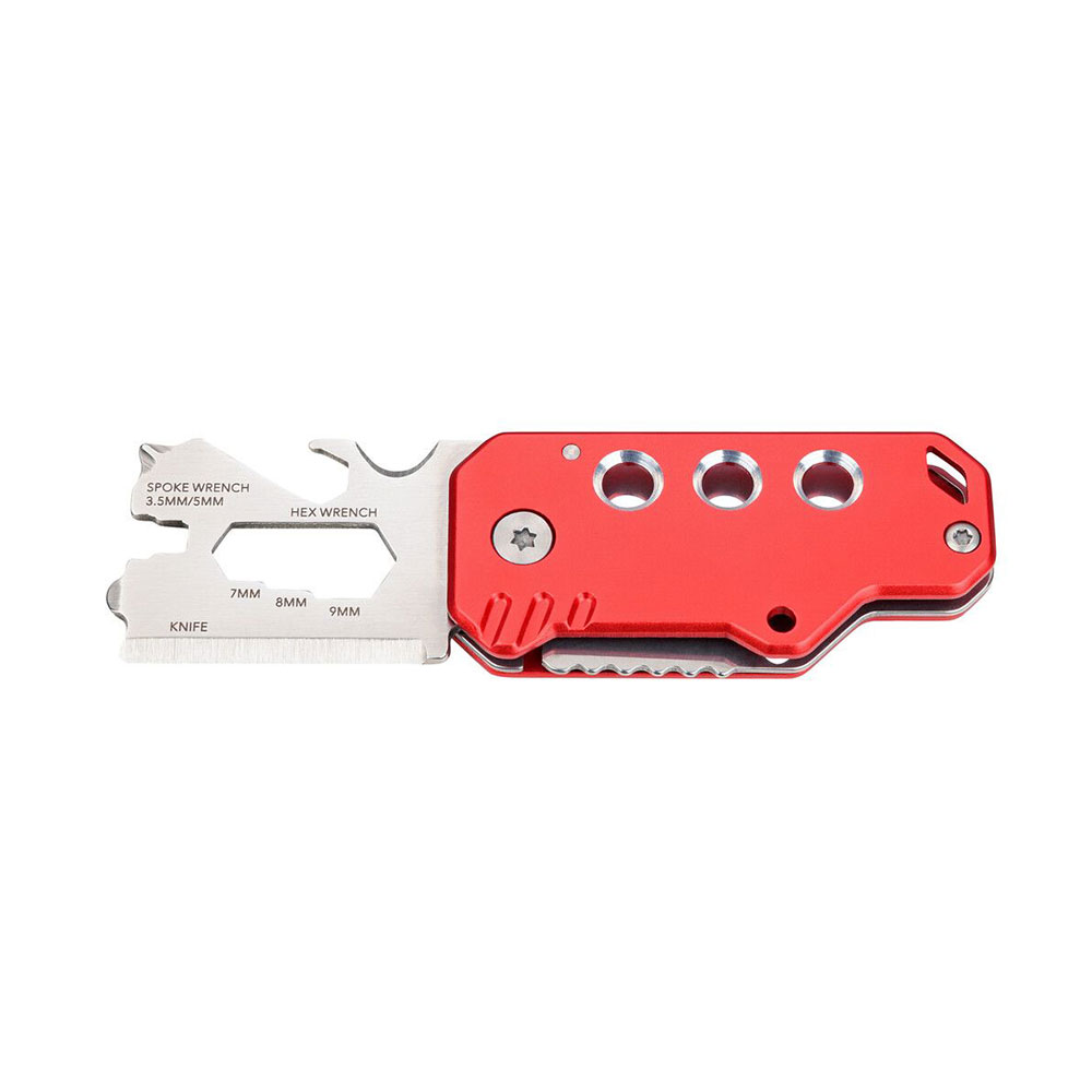 Miniherramienta multifuncional con 11 funciones: navaja, llavero (con anilla metálica), cortacuerdas, abrebotellas, llave hexagonal (4 tamaños), destornillador Phillips y plano. Fabricada en acero inoxidable 420 y aluminio, con acabado mate y color rojo.