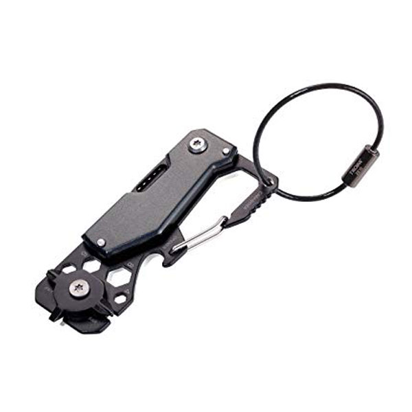 Llavero Multiherramienta de color titanio. Miniherramienta con 10 funciones, cuchillo, llavero (lazo de alambre) con mosquetón, abrebotellas, 3 destornilladores (2 de estrella, 1 plano), llave hexagonal (4 tamaños), cincel pequeño, regla (5 cm) y llave de radios.