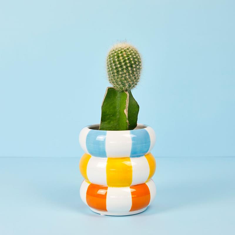 Jarrón con forma de flotadores apilados, ideal para regalar a los entusiastas del verano y del color. También es perfecto para los fans de las plantas. Elaborada en cerámica de primera calidad y pintada a mano; cada pieza es única.