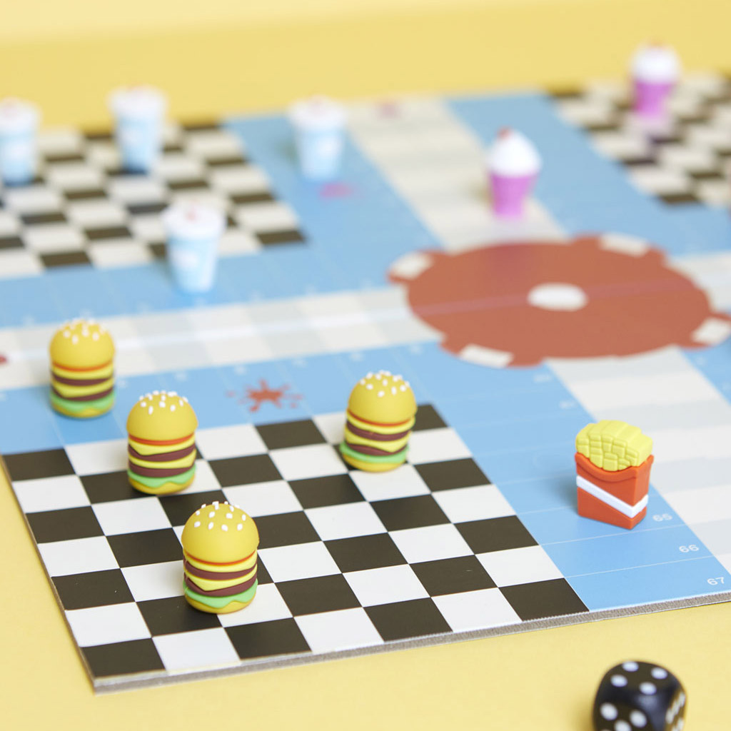 El clásico juego del parchís en una versión especial y colorida de comida rápida. Sé una hamburguesa, un helado, unas patatas fritas o un refresco. ¡Lleva toda tu comida a la mesa y gana!