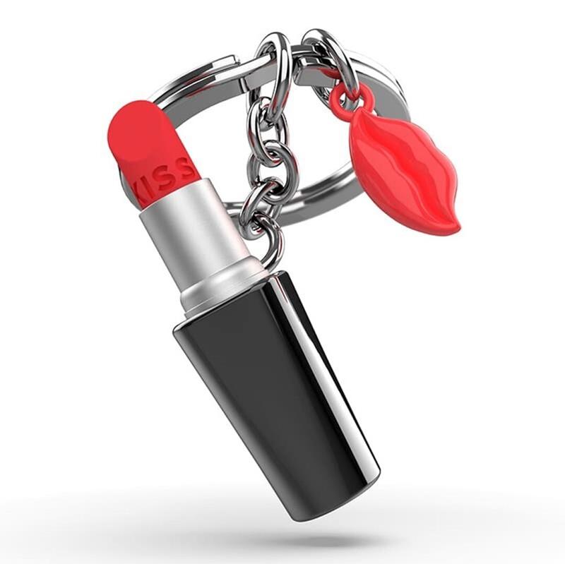 Llavero con un diseño exclusivo inspirado en un pintalabios. Presenta un acabado brillante en bullet, cromo mate y un charm rojo brillante, todo combinado con detalles en silicona para un toque moderno y elegante.