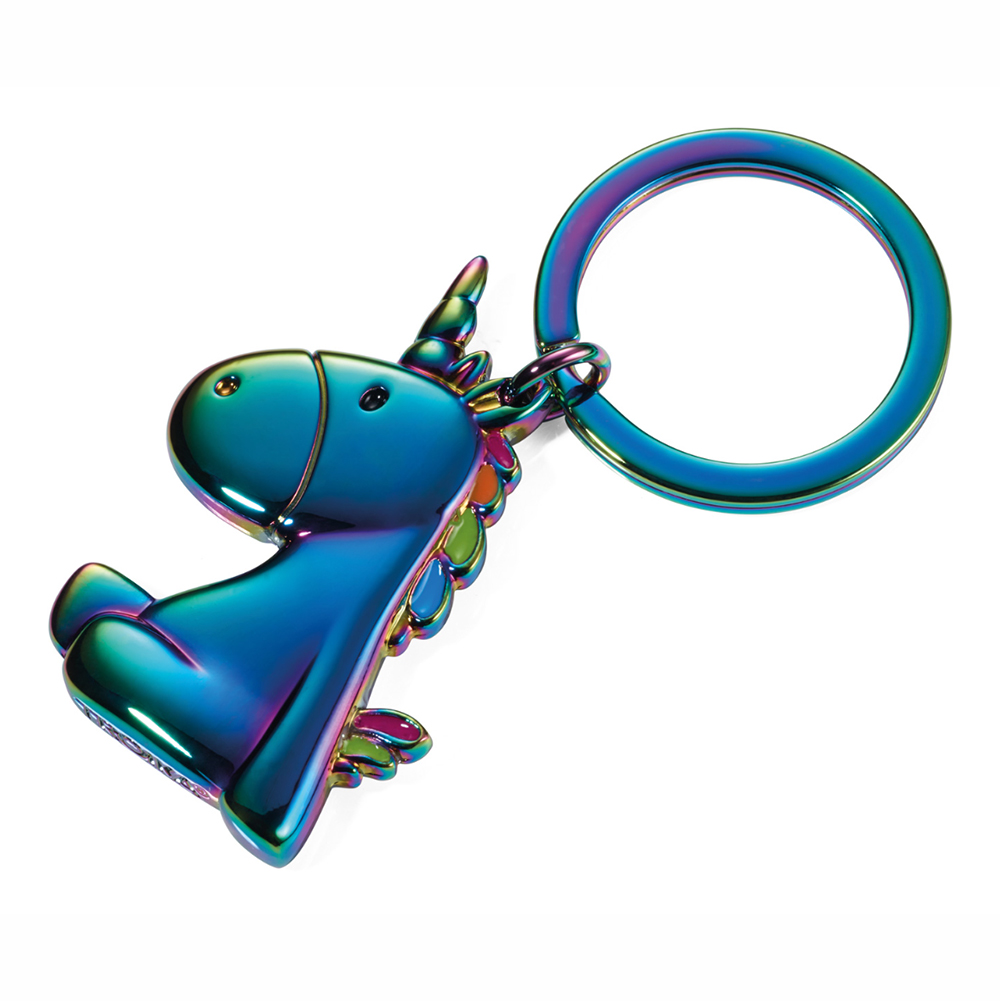 Llavero con forma de unicornio y acabado en metal que gracias a su coloración irisada del arco iris es un verdadero punto de atracción.