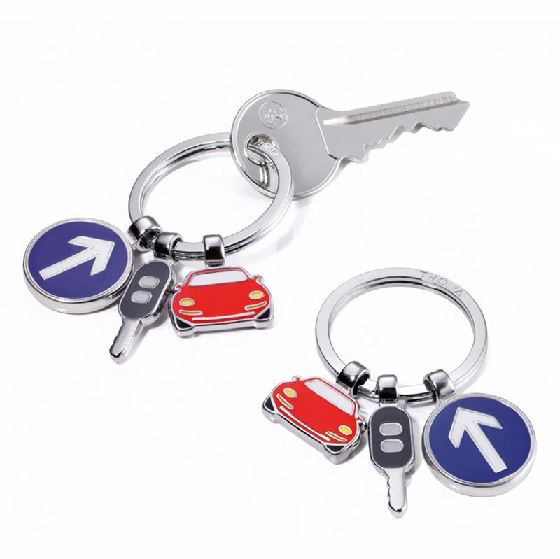 Llavero especialmente indicado para los amantes de los coches. Con tres figuras: un coche, unas llaves y una señal.