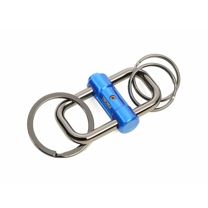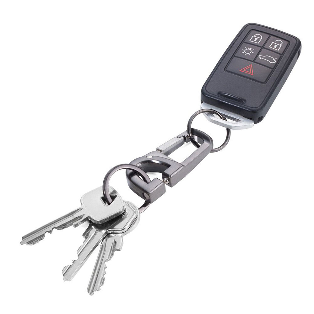 Llavero con doble mosquetón para poder añadir varios juegos de llaves. Mediante una pestaña se pueden colocar varios juegos de llaves en los dos sentidos.