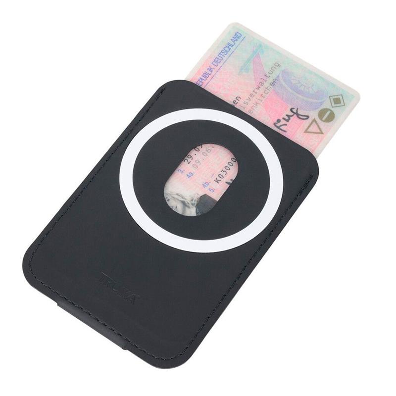 Funda MagSafe para 1 o 2 tarjetas con fijación magnética al smartphone. Permite colocar el teléfono en posición horizontal o vertical. Incluye un anillo metálico MagSafe adicional con adhesivo 3M para una fijación personalizada a smartphones, fundas, portátiles, etc. Imitación piel, color negro.