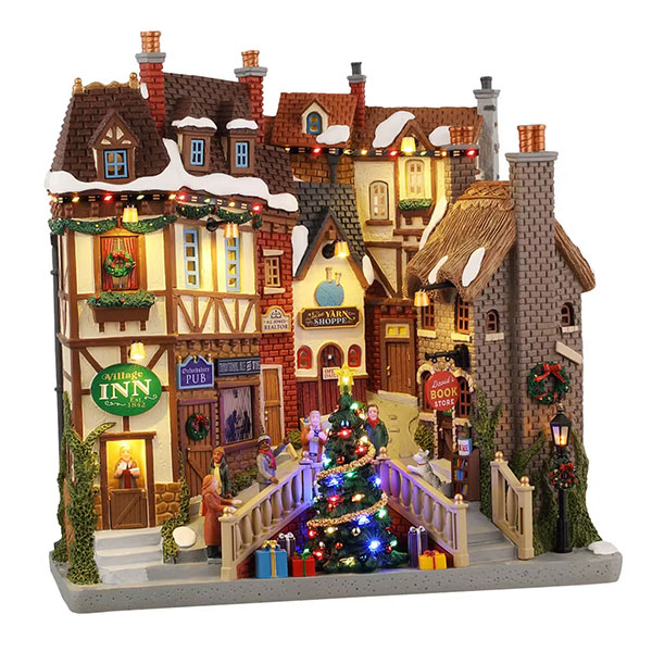 Fachada navideña con escaparates y ventanas iluminadas. Incluye luces parpadeantes en la fachada y figuritas tridimensionales en las ventanas y escaparates. Para completar tu pueblo navideño. Se puede colgar en pared.