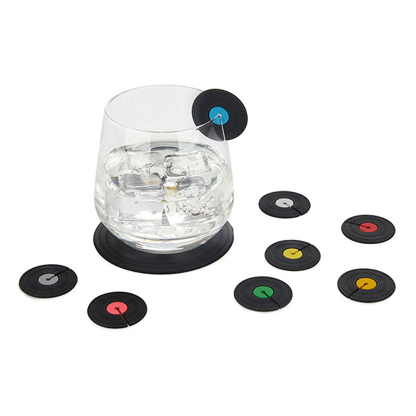 Original surtido de 8 marcacopas en forma de discos de vinilo. Ideales para evitar confusiones e identificar tu copa en reuniones entre amigos y familia.