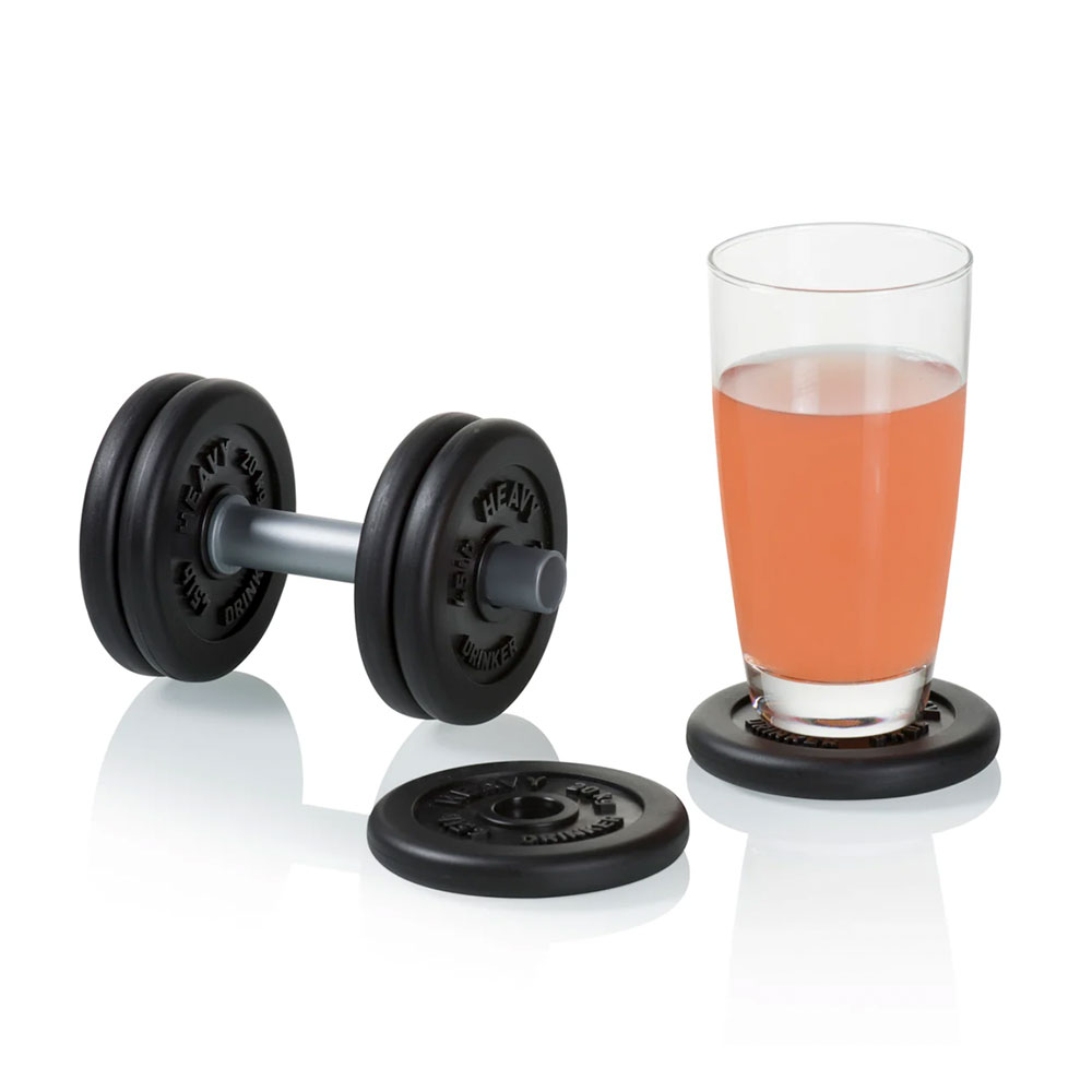 Divertidos posavasos con forma de pesas. Tiene disponibles 6 posavasos con una mancuerna para colocarlos y mantenerlos unidos.