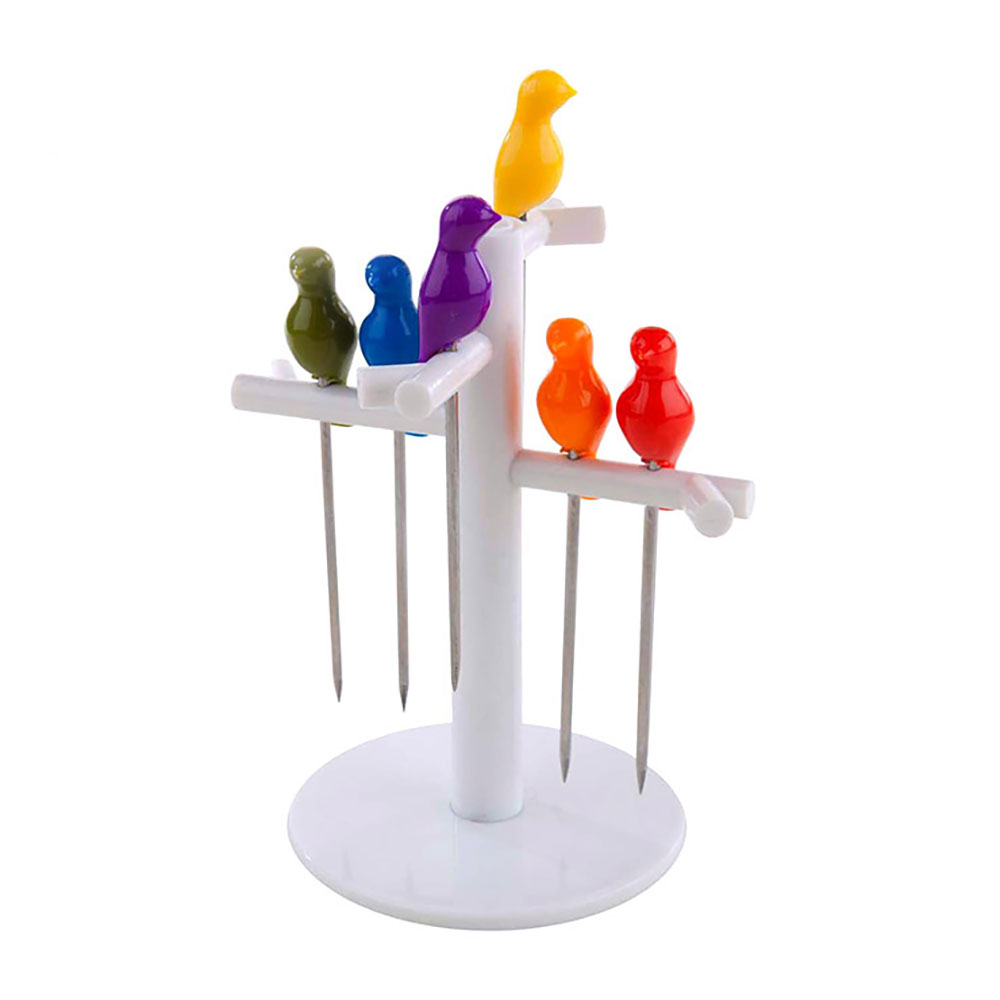 Set de 6 palillos para aperitivos. Palillos decorativos para aperitivos con forma divertida de pajaritos. Con base en forma de árbol para guardarlos, es ideal para decorar tus platos. No recomendamos lavarlos en lavavajillas.