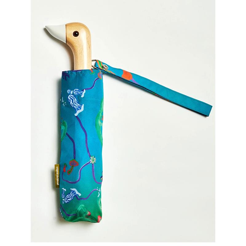 Divertido paraguas con el mango en forma de cabeza de pato. Hecho a mano con botellas recicladas (con cada paraguas se recuperan 12 botellas), su original mango hecho de madera hace que sea muy cómodo de llevar.