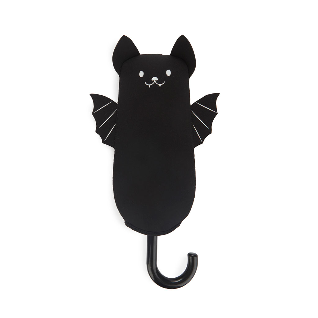 Divertido paraguas con forma de murciélago. Incluye una funda de neopreno con diseño de murciélago para poder guardarlo sin mojar el bolso o mochila. Protégete de acabar mojado sin dejar de lado el estilo.