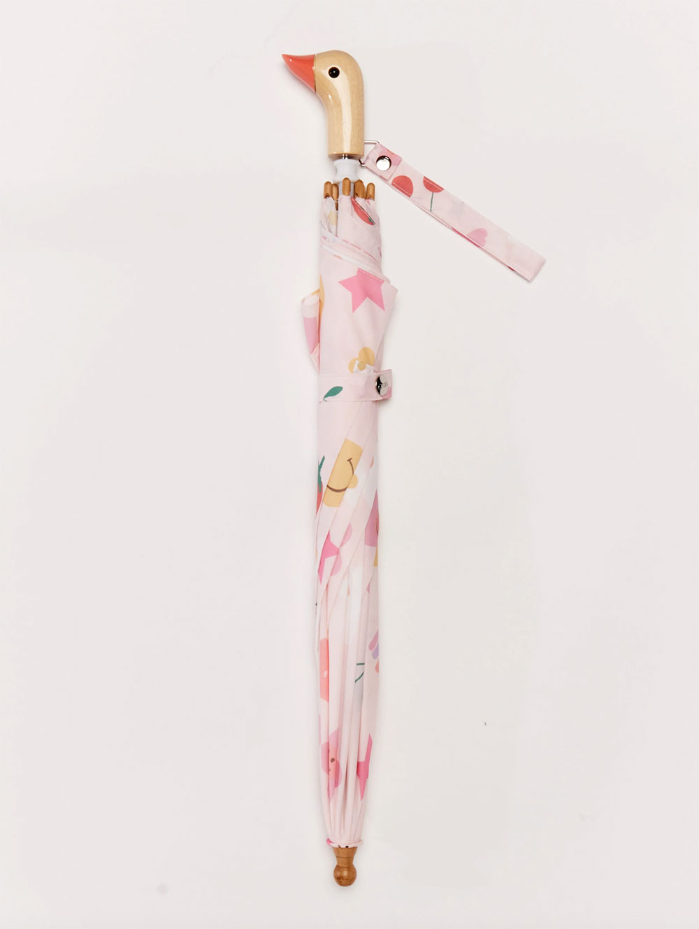 Divertido paraguas con el mango en forma de cabeza de pato. Hecho a mano con botellas recicladas (con cada paraguas se recuperan 12 botellas), su original mango hecho de madera hace que sea muy cómodo de llevar.