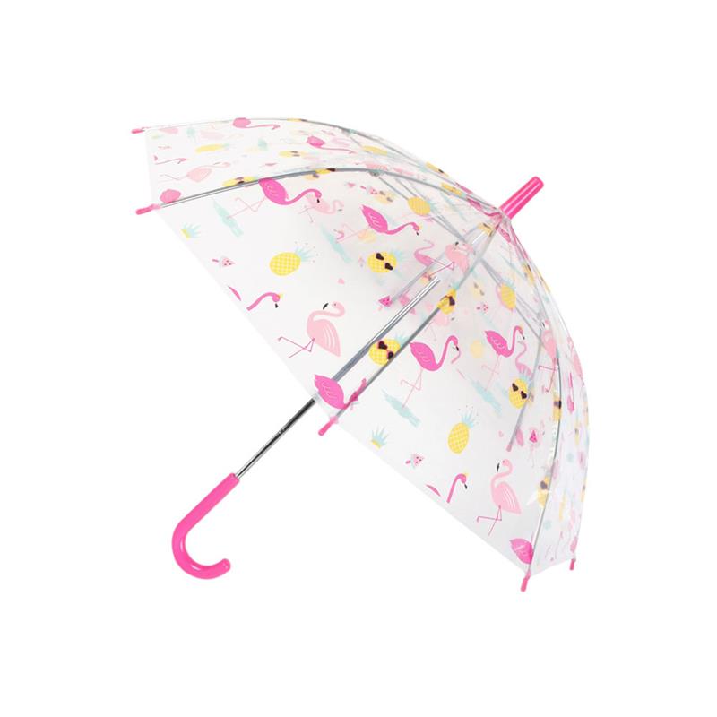 Paraguas transparente de pequeño tamaño y con dibujos impresos. Con apertura manual.