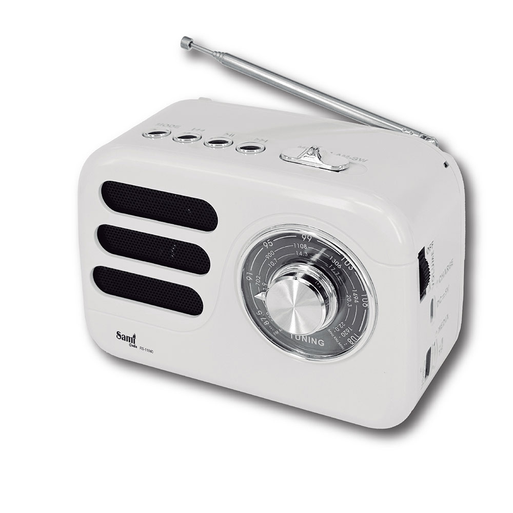 Radio modelo vintage con bluetooth. Funciona con una batería interna (recargable), con entrada para USB y tarjeta TF, antena telescópica y radio FM y AM. También permite conectar el móvil y usar la radio como altavoz.