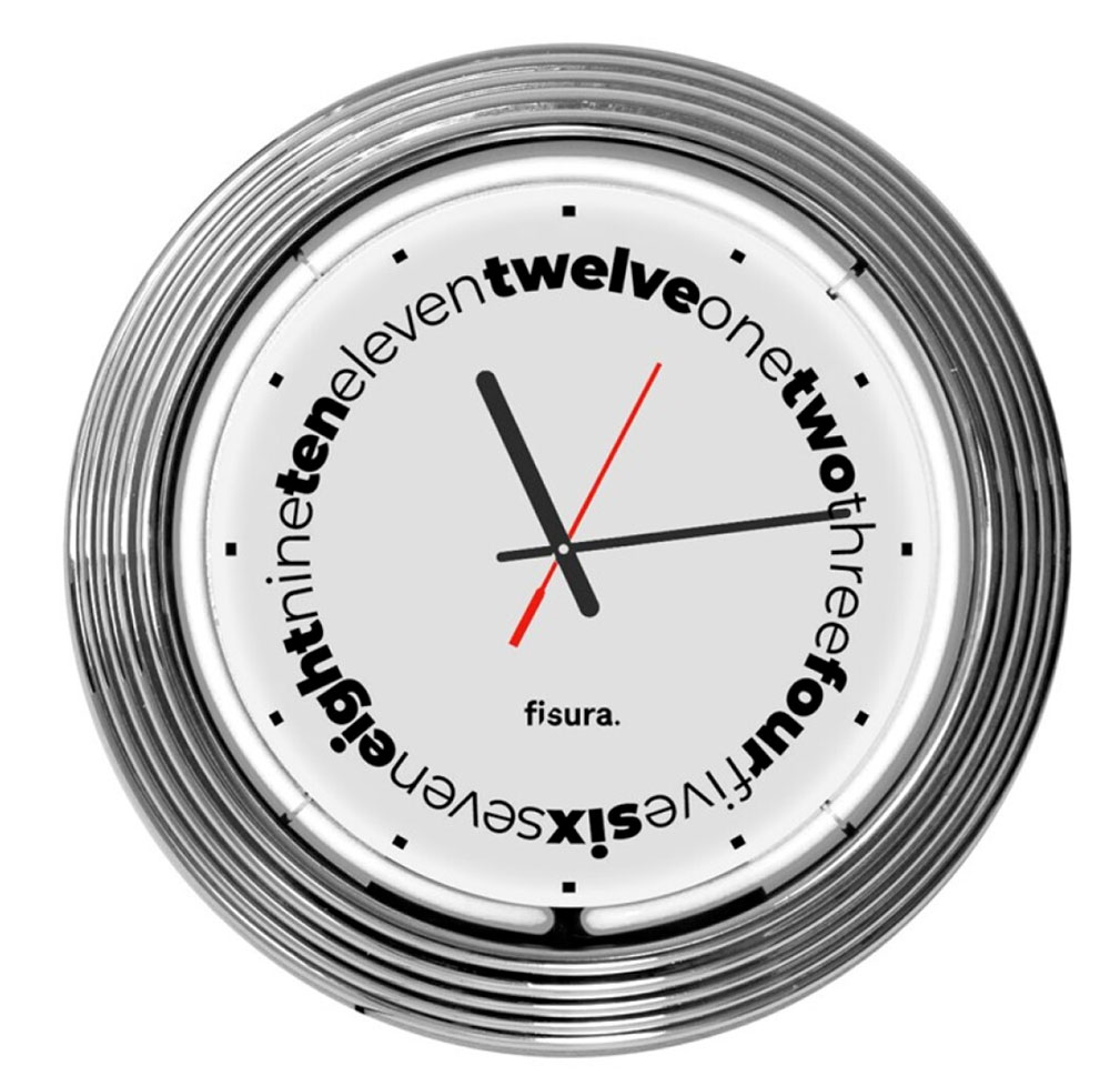 Reloj de pared con un neón blanco en el interior. Con un diseño que mezcla lo retro con lo actual. El reloj funciona con una pila AA, y se incluye un cable con interruptor para apagar y encender el neón. El mecanismo del reloj es silencioso y nunca deja de funcionar aunque apagues el neón.
