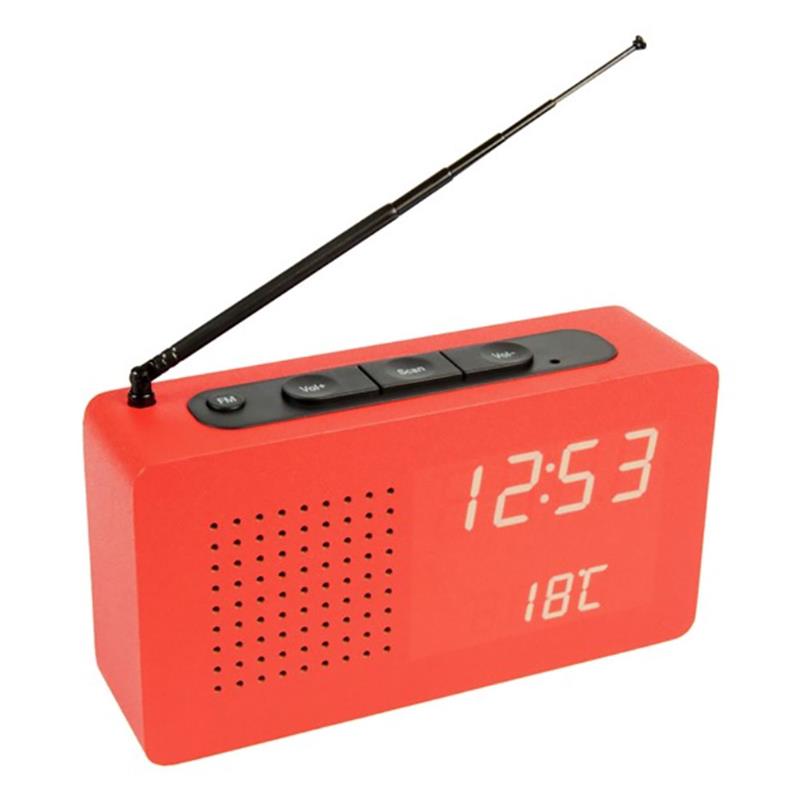 Radio reloj despertador en color rojo en la que podrás escuchar tus programas de radio favoritos a cualquier hora. Además, esta radio de madera también muestra la hora, la fecha y la temperatura ambiente.. ¡Y puedes utilizarlo como alarma!