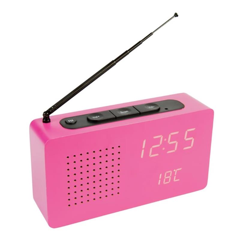 Radio reloj despertador en color rosa en la que podrás escuchar tus programas de radio favoritos a cualquier hora. Además, esta radio de madera también muestra la hora, la fecha y la temperatura ambiente.. ¡Y puedes utilizarlo como alarma!