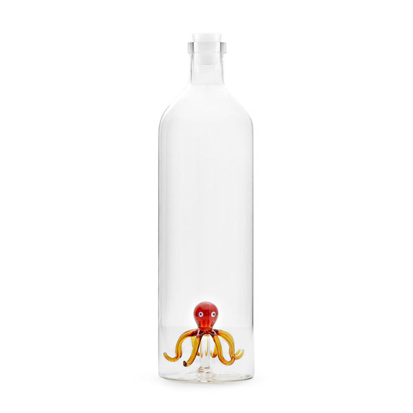 Botella de vidrio para agua. Contiene la figura de un pulpo. Al poner el agua hace efecto lupa y se amplía la figura interior.
