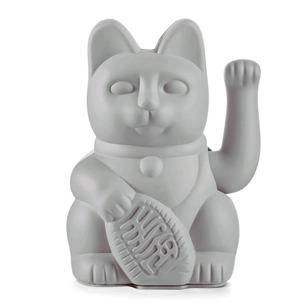 Gato de la suerte en color gris, el color de la estabilidad y la seguridad. Según la leyenda, este gato trae buena suerte a su dueño. Maneki-neko como lo llaman en Japón, que es su país de origen, es una pieza ideal para decorar tus espacios o para regalar suerte, estabilidad y seguridad.
