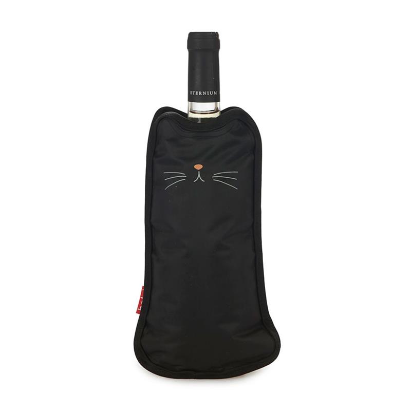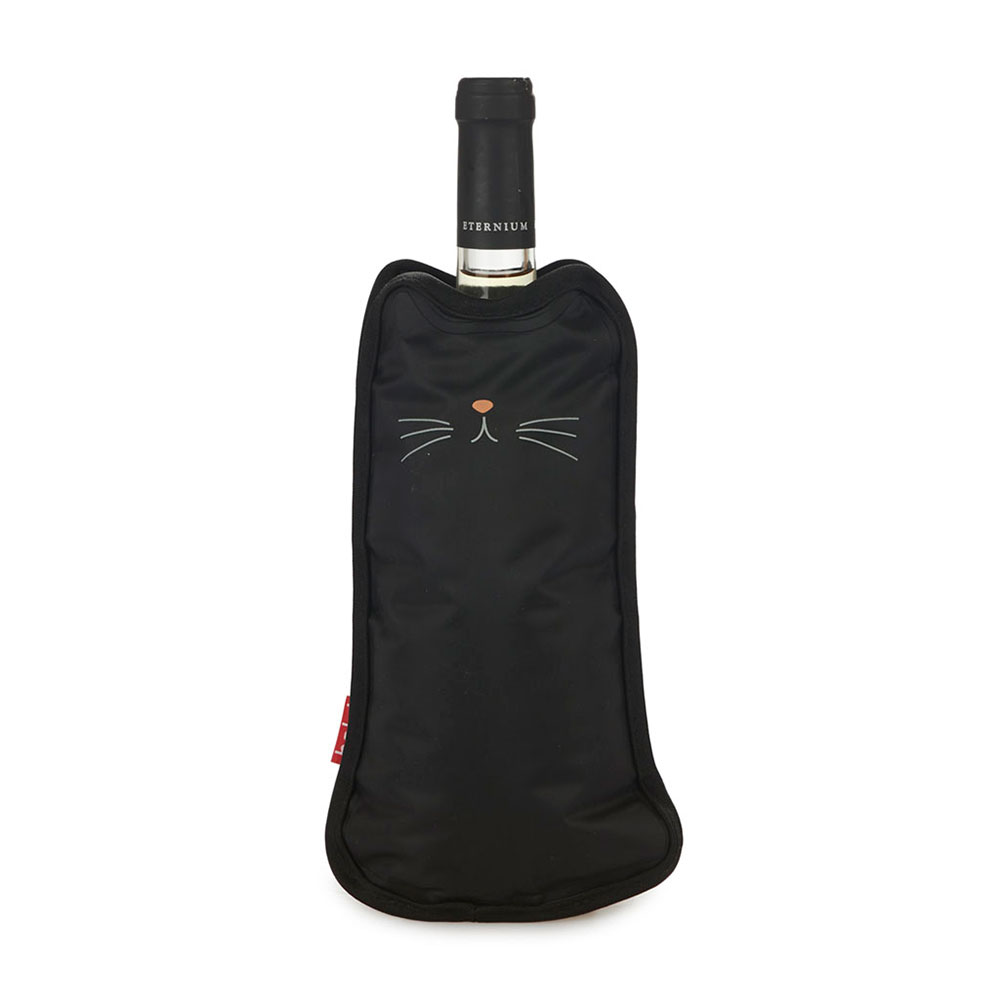 Enfriador de vino con acabado en tela y relleno de gel. Lo introduces en el congelador y cuando necesitas el vino fresco lo sacas a la mesa y ¡ya está!, tu vino fresco toda la comida. Como lleva gomas en los laterales, se adapta al tamaño de la botella, y se puede utilizar para vino, champán, etc.